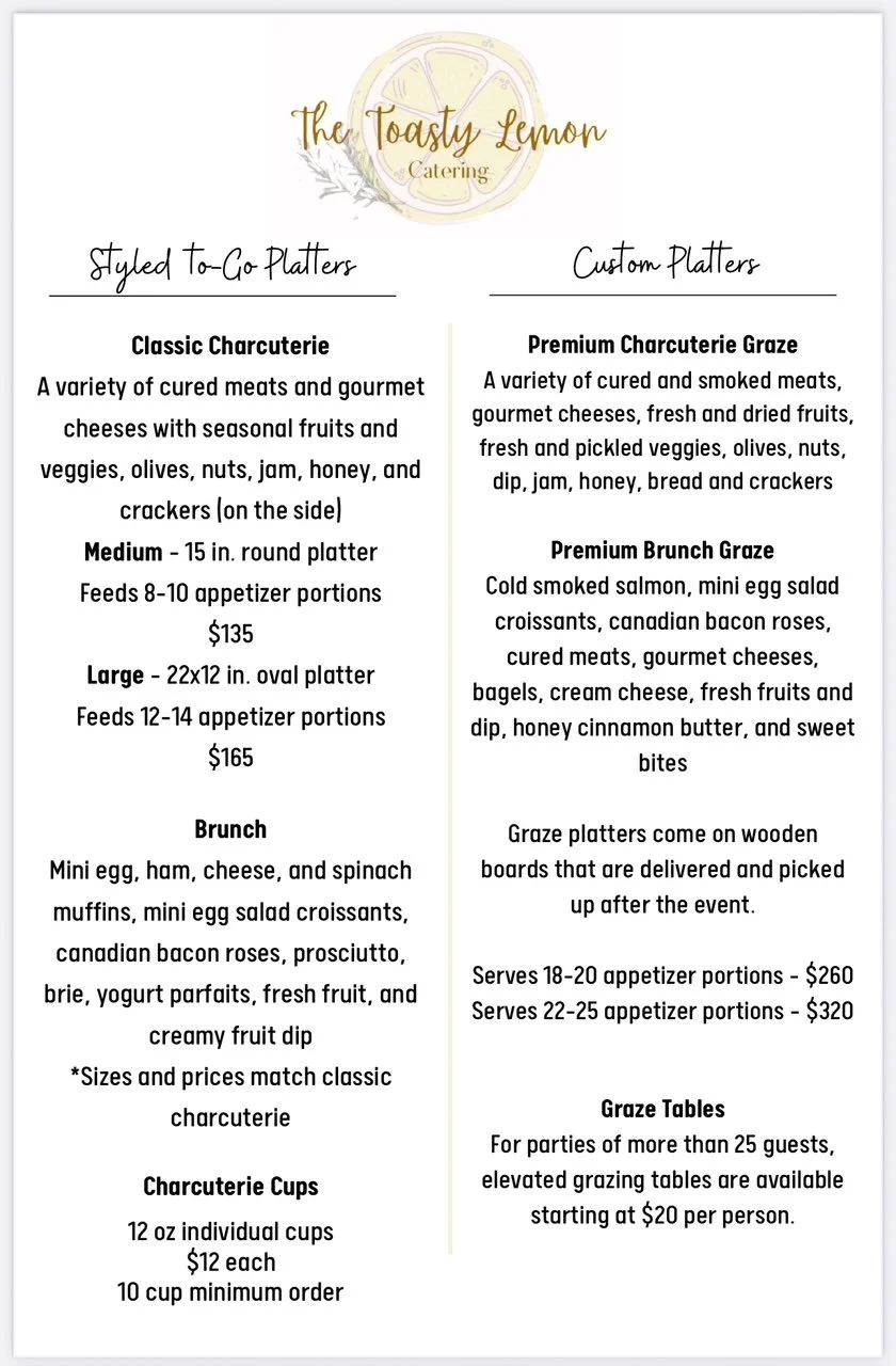 From charming charcuterie and signature pasta salads to craveable crostinis and handcrafted dips, our catering menu is designed to impress. Whether you're planning a bridal shower, corporate lunch, or an intimate gathering, The Toasty Lemon brings flavor, flair, and a touch of whimsy to every event.